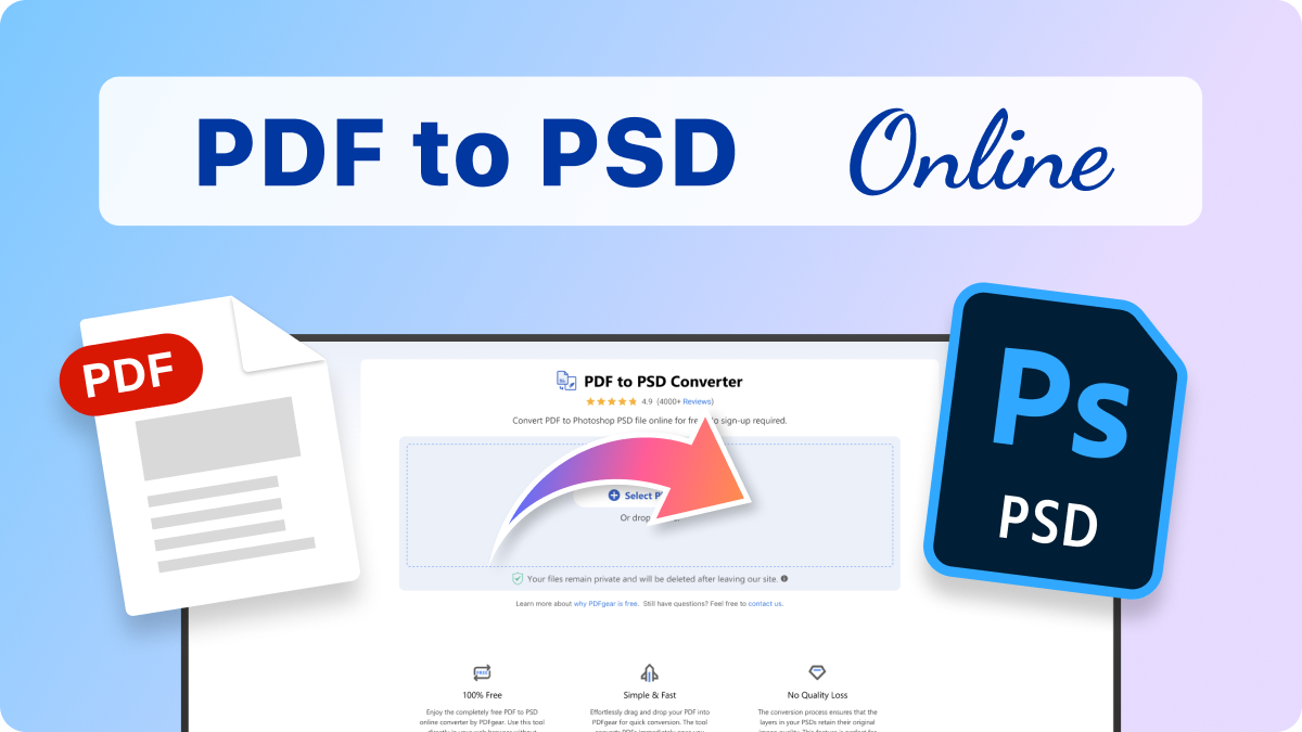Enjoy the completely free PDF to PSD online converter by PDFgear. Use this tool directly in your web browser without signing up for an account with your email or credit card details.