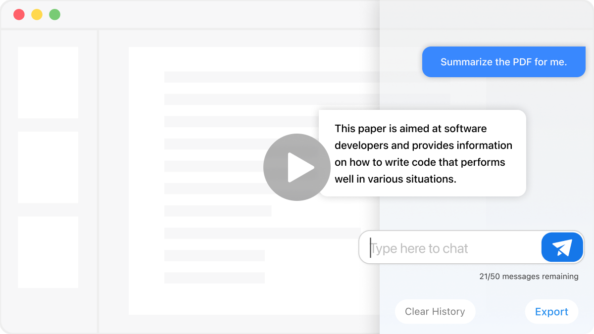 Manually reading PDFs is now history. With PDFgear Chatbot powered by ChatGPT, you can easily read PDFs, search for information, explain concepts, summarize length PDFs, analyze complex PDFs, translate PDFs, and even rewrite PDFs.