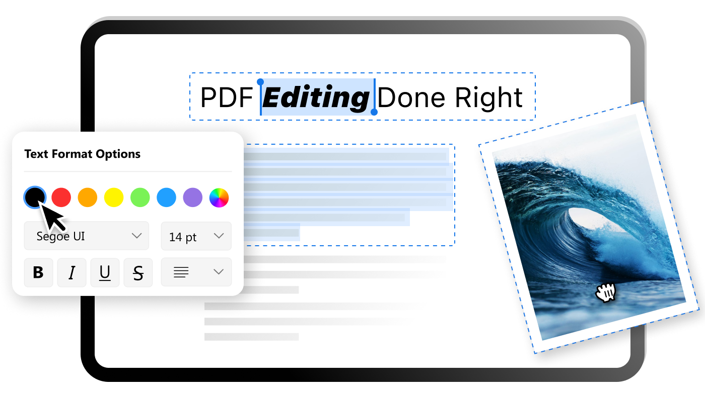During the editing, you get to freely customize text formatting such as fonts, styles, sizes, symbols, etc., highlight text, and underline/strikethrough annotations. Otherwise, the original formatting is retained.
