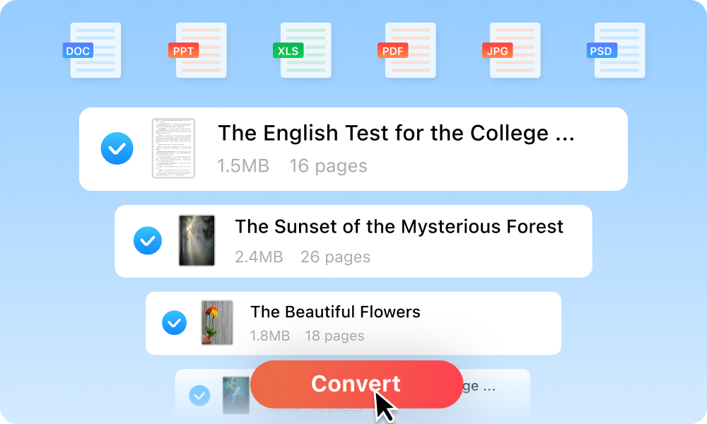 Easily merge multiple JPEGs, PNGs, or PDFs into a single PDF with PDFgear's batch PDF merge feature. Streamline the process with a few simple clicks.